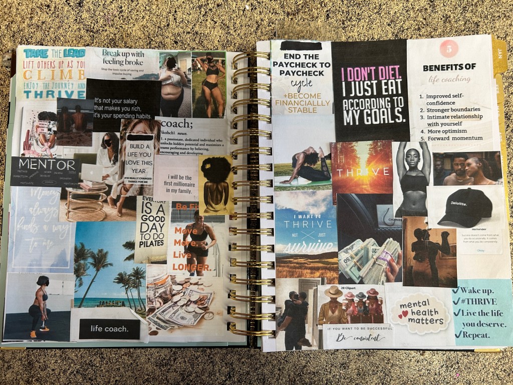 Thrive. Conscious spending. Weight loss. Reading. A beach with my boo. Mentorship. Professionalism. Intention. Affirmations. Contentment. Strength training. A trip to Jamaica. Execution. Pilates. Endless streams of income. Healthy living. Yoga. Deloitte. Love. Peace. Intimate moments. Savings. My tribe. Consistency. Mental health. Thrive.