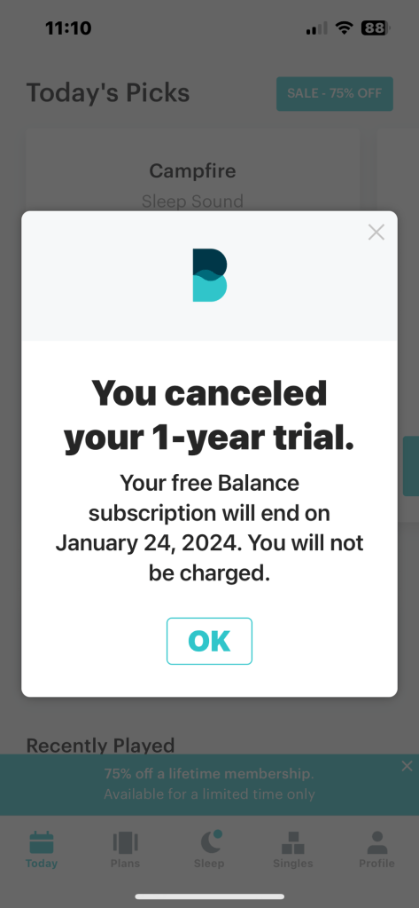 My Balance membership free trial is coming to an end soon and will cost $99 to renew for year two. I will research an alternative application that costs less annually or even utilize YouTube for meditation purposes.