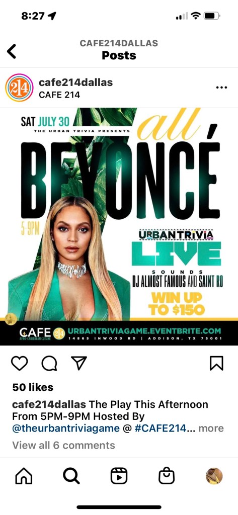 There was a Beyoncé trivia night at Cafe 214 last Saturday. I heard about the event and immediately text a bunch of friends, bought a table and started to plan an outfit that was Beyoncé worthy.